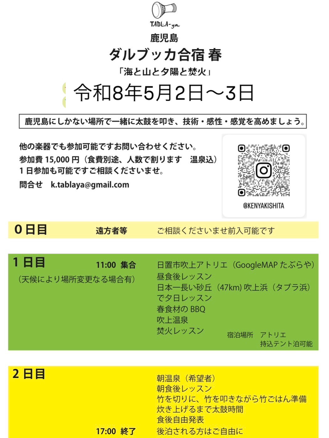 年3回行う「たぶらや合宿」のうち春合宿は竹ご飯や春の海、焚き火しながらじっくり音やリズムに向き合いましょう。
